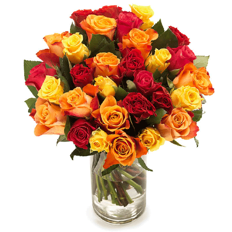 An amazing bouquet of roses in orange, red and yellow colors. Small:12 stems Medium:24 stems Large:48 stems