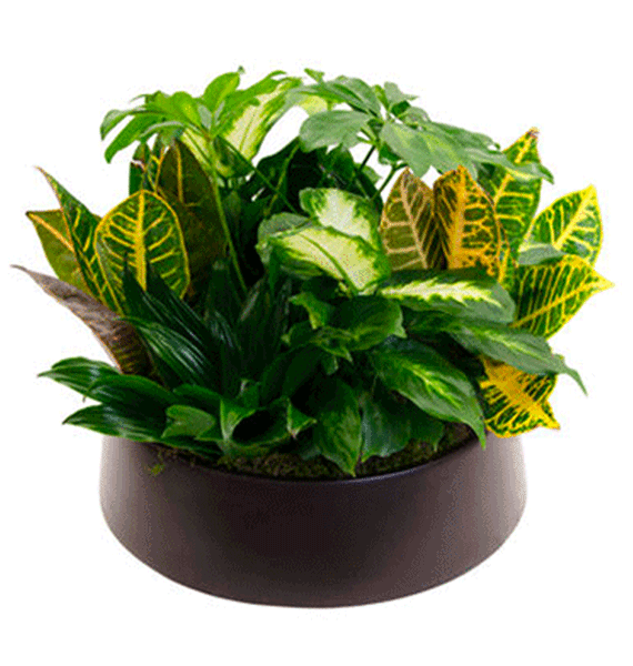 A mix of croton, compacta, and schefflera leafs