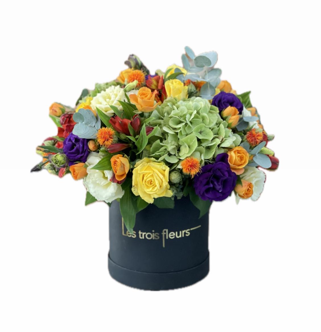 Black Box Filled With Fluffy Shaped Flowers In Addition To A Pop Of Color. Small, Medium, Large.