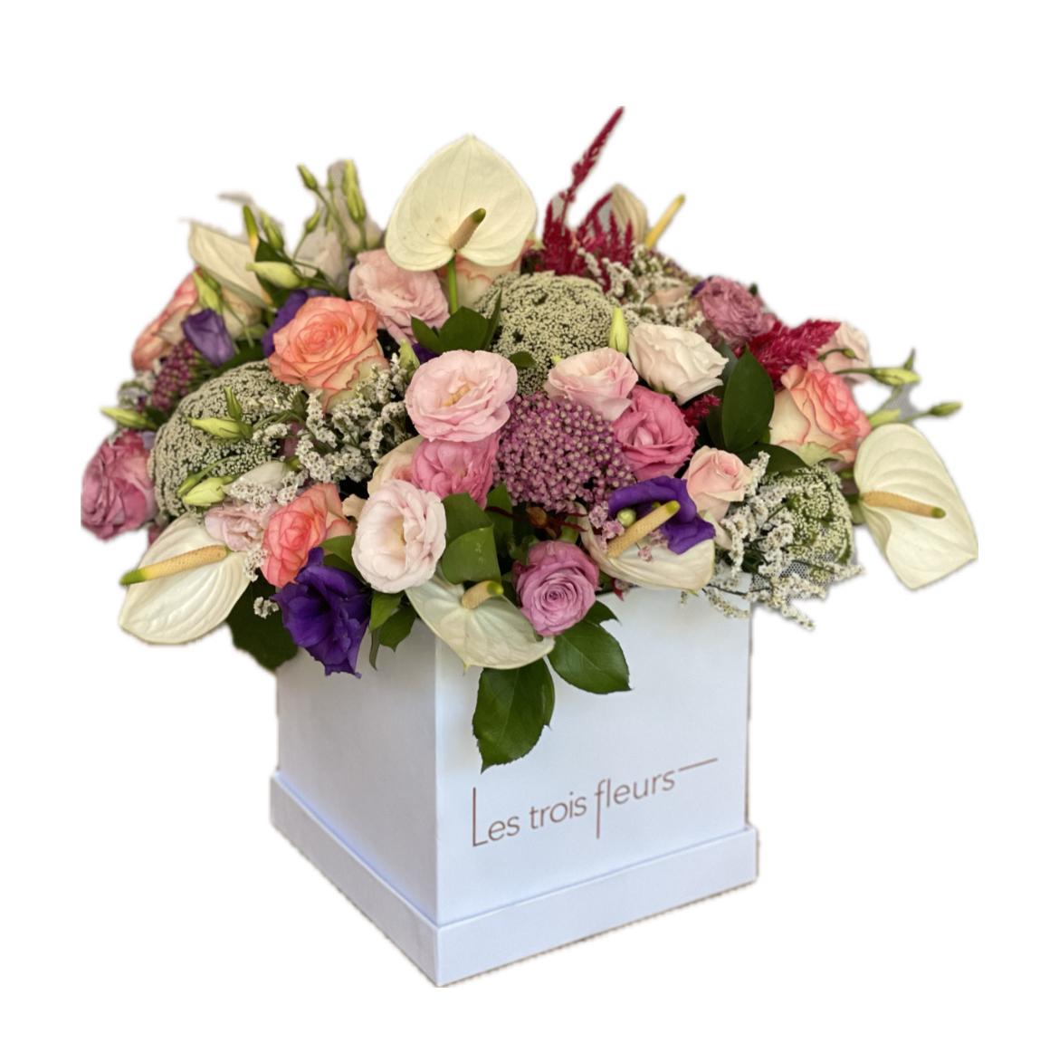 Small White Square LTF Box Filled With Pastel Selection In Addition To Anthurium