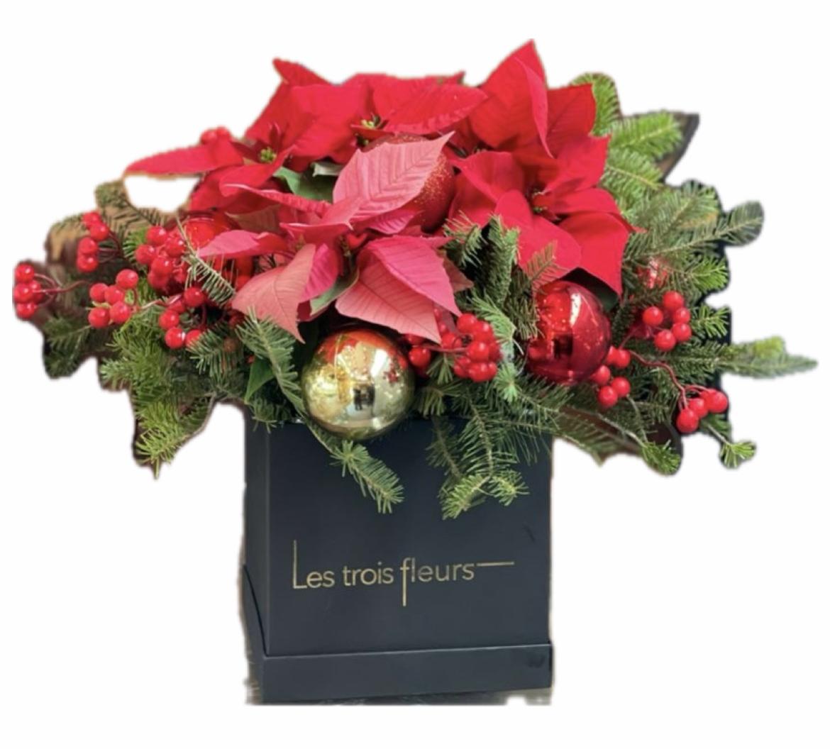 A mix of red berries branches, greenery, poinsettia and christmas ornaments in a black LTF medium square box