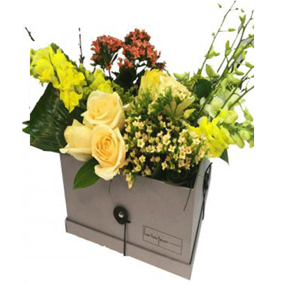 Exotic greenery arranged in a box along with premium flowers