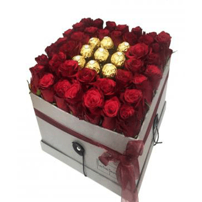 Deluxe red roses bordering a Ferrero Rocher chocolate pieces in a large square box.