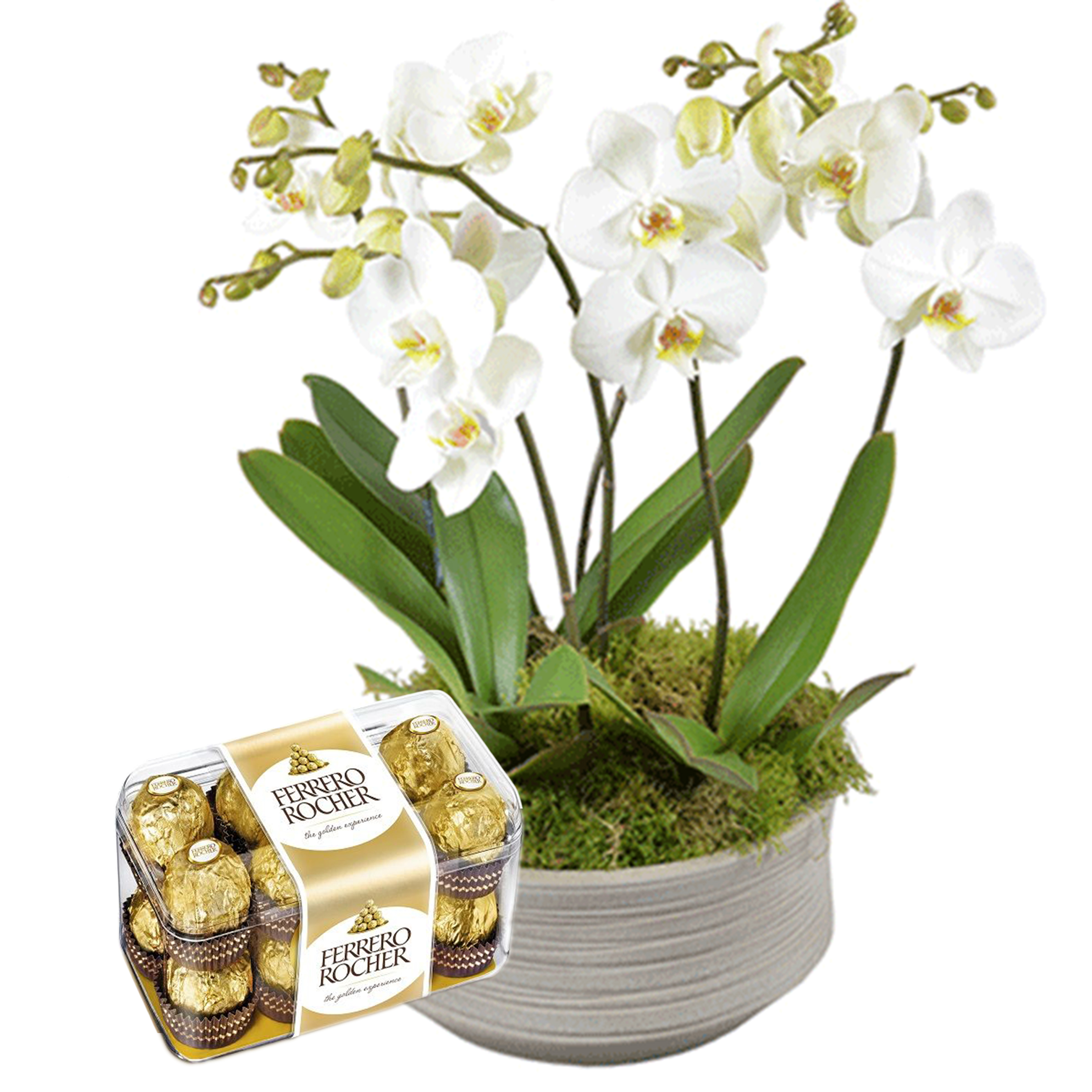 White orchid plant in addition to ferrero rocher box