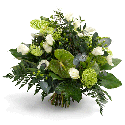A bunch of exotic greenery combined with white baby rose