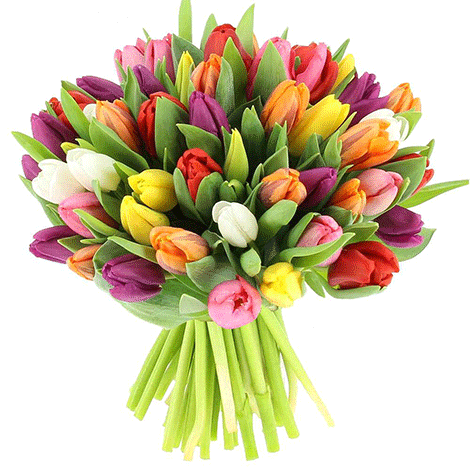 A lovely combination of six different colors of tulips in one cheerful spirited bouquet. Small:12 stems Medium:24 stems Large:48 stems